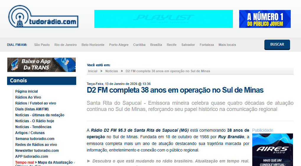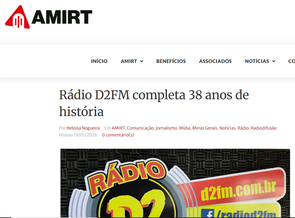 A Rádio D2FM comemorou 38 anos neste domingo, dia 18 de janeiro de 2026 e a trajetória é reconhecida por importantes canais especializados em radiodifusão no país. O aniversário da emissora foi destaque em portais do segmento, como a Associação Mineira de Rádio e Televisão (Amirt) e o Tudo Rádio, que ressaltaram a relevância histórica e regional da D2FM no cenário da comunicação.